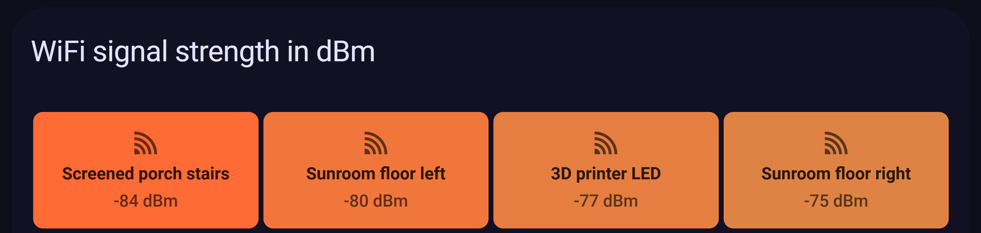 In a home with multiple access points, signal strength (dBm) is typically hidden away in attribute menus. Using this card, I’ve turned those attributes into a visual map of my Wi-Fi health. I can see that while my 3D printer is solid at -69 dBm, the “Screened porch stairs” are dipping into the -77 dBm range. Sometimes sensors do not pick an optimal access point and try to cling to a weak signal. I've been able to remediate a few of these issues by locking a sensor to an AP that definitely has a better signal.