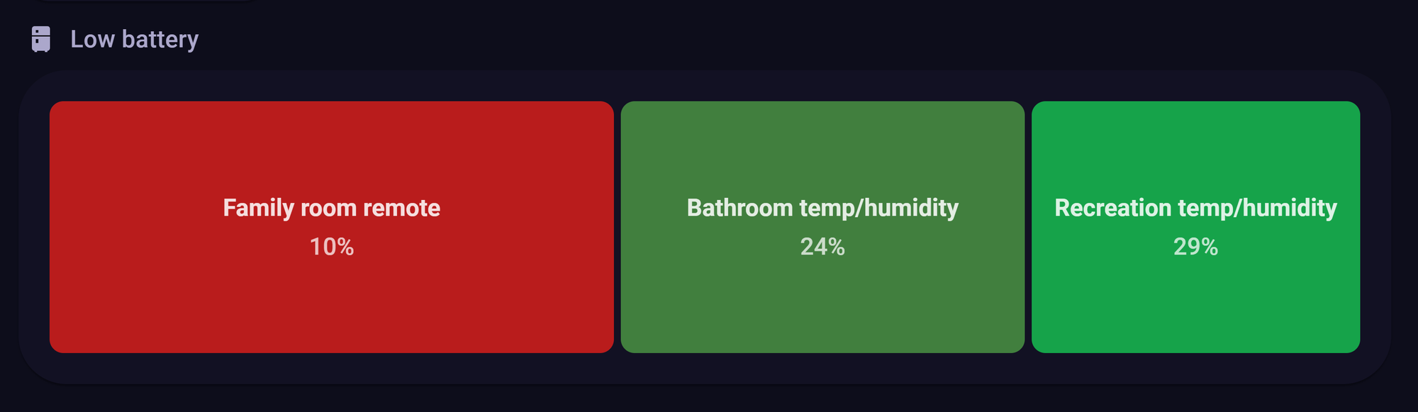 Importantly, I also include sensors that are “unavailable” or “unknown.” These often require faster remediation than a low battery, as they've already dropped off the network. This view makes them impossible to ignore and allows for “batching” maintenance rather than reacting to sensors only after they fail.